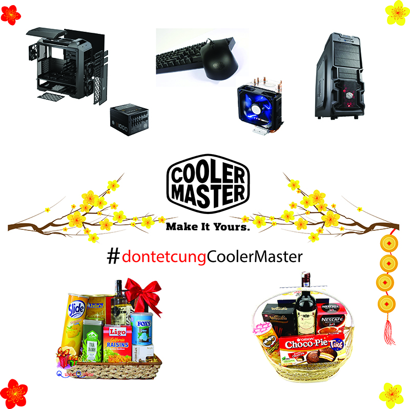 | Chương trình : Đón tết cùng Cooler Master (Thời gian : từ 1/1 đến 15/1/2017) Đối tượng: người dùng cuối - Nội dung: người dùng post hình máy tính của mình lên trang cá nhân, sử dụng hastag #dontetcungCoolerMaster - Quà tặng: 1 Giải đặc biệt : 1 giỏ quà tết trị giá 2 triệu đồng. 2 Giải khuyến khích : 2 giỏ quà tết trị giá mỗi giỏ 1 triệu đồng. - Điều kiện: sử dụng hastag, hệ thống máy tính sử dụng ít nhất các sản phẩm sau: case + psu cooler master hoặc keyboard + mouse Cooler Master hoặc case + tản nhiệt Cooler Master. |